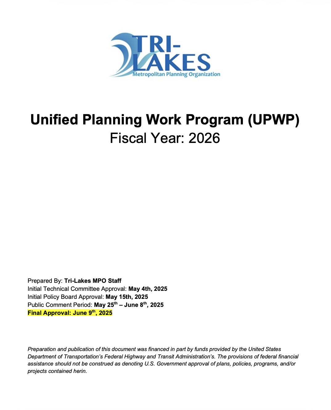 A Unified Planning Work Program (UPWP) identifies planning activities that staff will undertake over that period (fiscal year), and the associated budget for the MPO’s upcoming fiscal year (July 1st – June 30th). The UPWP is prepared annually, typically being presented and discussed during the spring (March – May).